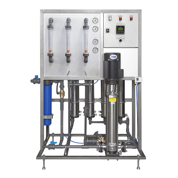 Особенности и преимущества: высоконапорный центробежный горизонтальный насос Grundfos CM-I с низким электропотреблением, кондуктометр (TDS метр) для контроля качества очищенной воды (электропроводности пермеата), регулировка расхода насоса во всем диапазоне, высокотехнологичное реле Danfoss KPI-35 защищает систему от низкого давления или отсутствия воды на входе, что предохраняет насос от перегрева и выхода из строя, точная регулировка потоков пермеата, концентрата и рецикла, встроенные индикаторы, отображающие работоспособность системы, широкий диапазон применяемых сверхнизкоконапорных мембранных элементов, удобное подключение датчика уровня, насоса дозатора и датчика реагента, очистка воды на 99.8% от всех примесей, включая бактерии и вирусы, повышенная энергоэффективность благодаря качественным мембранным элементам и насосам Grundfos, возможность подключения блока промывки (CIP), что позволяет проводить обслуживание без сложного демонтажа, высокое качество комплектующих и их сборки, тщательный инженерный подход.